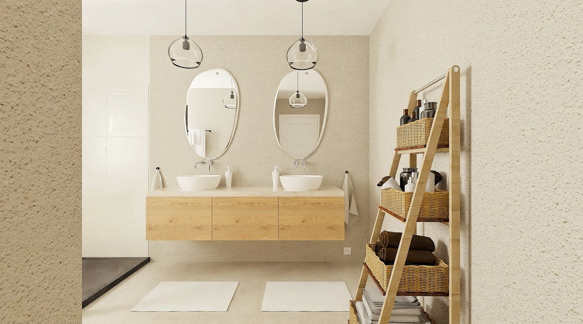 Aménagement d'une salle de douche en enlevant la baignoire et en intégrant un meuble double vasque suspendu et une douche.