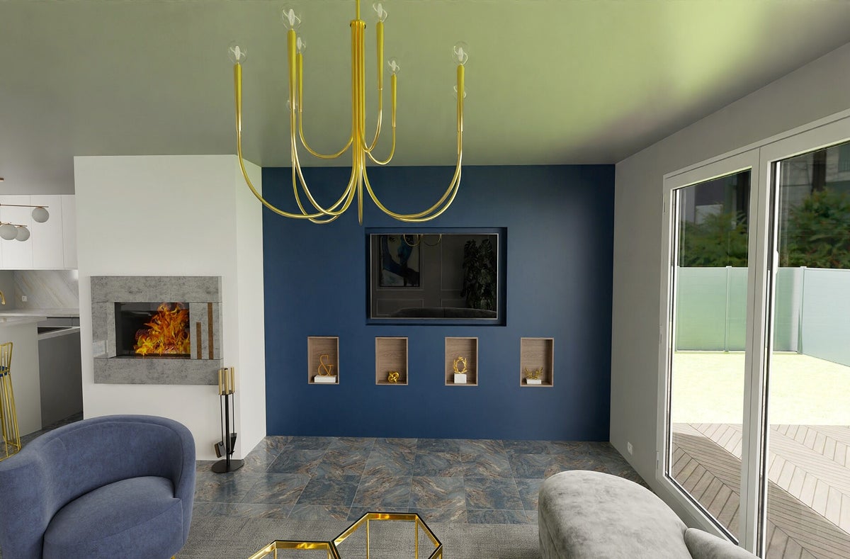 Ce jeune couple souhaitait une décoration originale, avec une personnalité forte et élégante à la fois pour leur séjour avec cuisine ouverte; avec pour seule consigne de conserver le carrelage bleu au sol.
